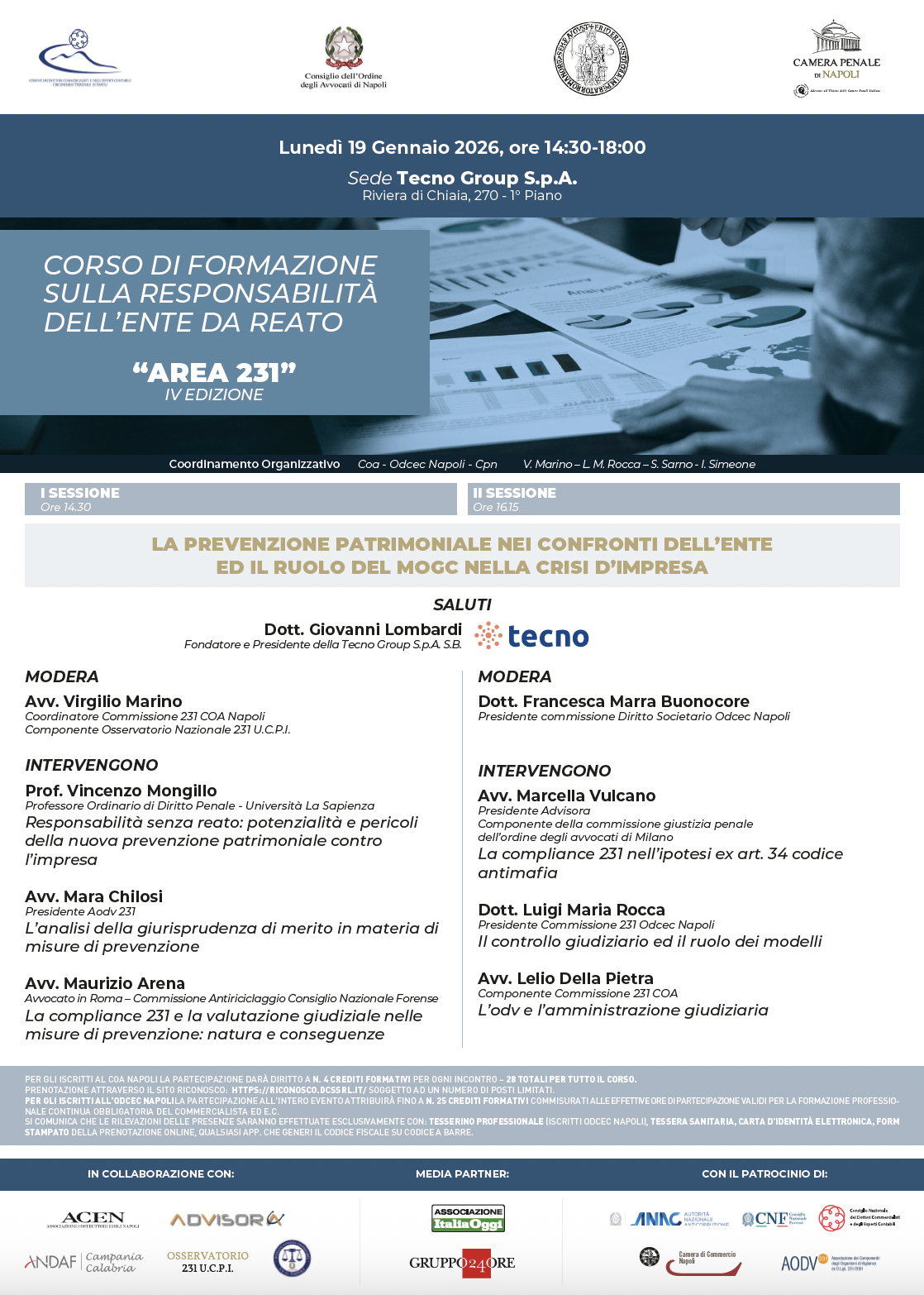 Il 19 gennaio ’26, dalle 14.30 alle 18.00, presso la prestigiosia sede della Tecno S.p.a., in Via Riviera di Chiaia 270, si terrà, la VI ed ultima lezione del IV edizione del Corso di formazione sulla responsabilità dell’ente da reato, Area 231, dal titolo “La Prevenzione patrimoniale nei confronti dell’ente ed il ruolo del Mogc nella crisi d’impresa“, in presenza, coorganizzato dal Coa Napoli, attraverso la Commissione 231 sulla responsabilità dell’ente da reato, coordinata dall’Avv. Virgilio Marino, unitamente a Cpn Napoli, Odcec Napoli e Dipartimento di Giurisprudenza dell’Università Federico II, cattedra di diritto penale, nel proficuo lavoro di coordinamento tra diversi enti, con il prestigioso patrocinio di Anac, Autorità Nazionale Anticorruzione, Consiglio Nazionale dei dottori commercialisti ed esperti contabili, Camera di Commercio di Napoli, Aodv231, Associazione degli organismi di vigilanza, ed in collaborazione con Acen, Associazione costruttori edili di Napoli, Andaf Campania e Calabria, Osservatorio nazionale 231 dell’Unione Camere Penali Italiane; media partner Associazione Italia Oggi e Gruppo Sole24ore.