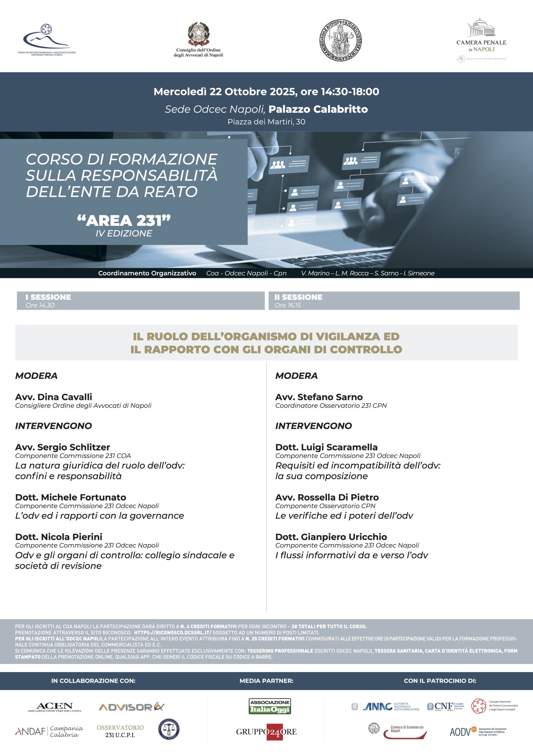 Il 22 ottobre ’25, dalle 14.30 alle 18.00, presso la sede di Odcec Napoli, in Piazza dei Martiri, 30, si terrà, la V lezione, dal titolo “Il Ruolo dell’Organismo di Vigilanza ed il rapporto con gli organi di controllo“, in presenza, della IV edizione del Corso di formazione sulla responsabilità dell’ente da reato, Area 231, coorganizzato dal Coa Napoli, attraverso la Commissione 231 sulla responsabilità dell’ente da reato, coordinata dall’Avv. Virgilio Marino, unitamente a Cpn Napoli, Odcec Napoli e Dipartimento di Giurisprudenza dell’Università Federico II, cattedra di diritto penale, nel proficuo lavoro di coordinamento tra diversi enti, con il prestigioso patrocinio di Anac, Autorità Nazionale Anticorruzione, Consiglio Nazionale dei dottori commercialisti ed esperti contabili, Camera di Commercio di Napoli, Aodv231, Associazione degli organismi di vigilanza, ed in collaborazione con Acen, Associazione costruttori edili di Napoli, Andaf Campania e Calabria, Osservatorio nazionale 231 dell’Unione Camere Penali Italiane; media partner Associazione Italia Oggi e Gruppo Sole24ore.